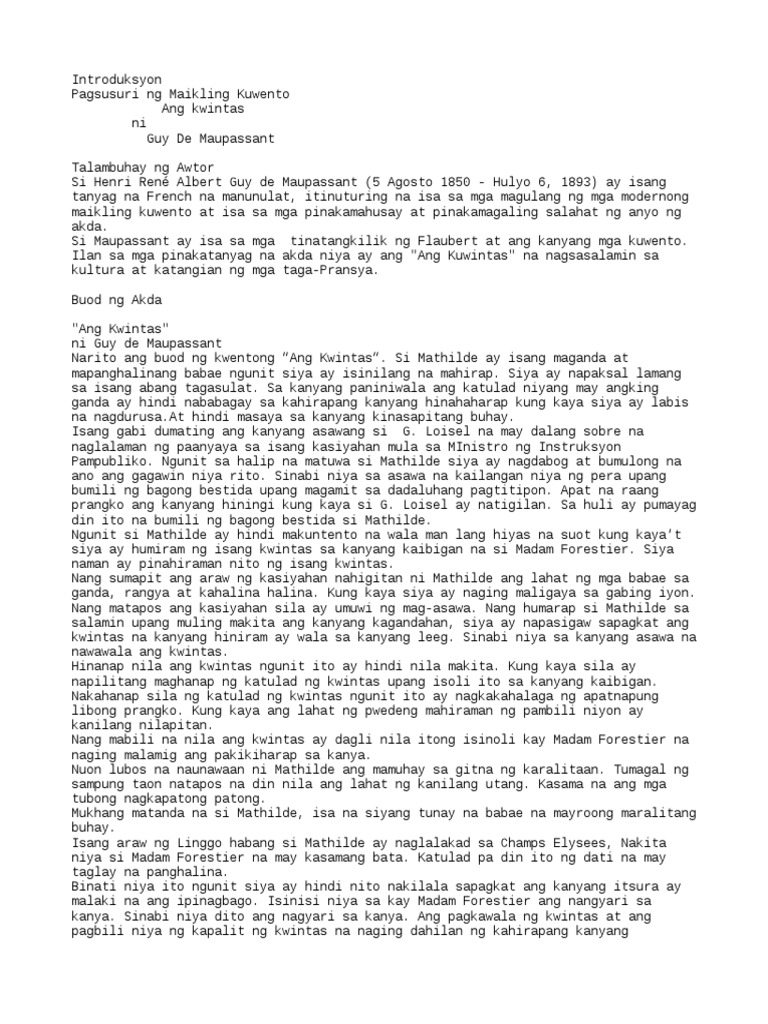 Ang Kwintas Buod Ng Isinulat Ni Guy De Maupassant