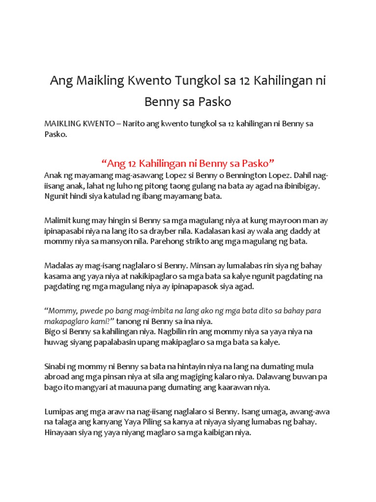 Ang Maikling Kwento Tungkol Sa 12 Kahilingan Ni Benny Sa Pasko Docx