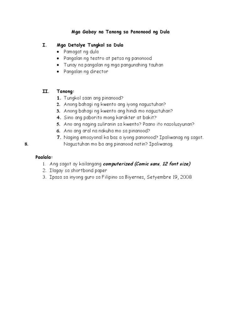 Mga Gabay Na Tanong Sa Panonood Ng Dula