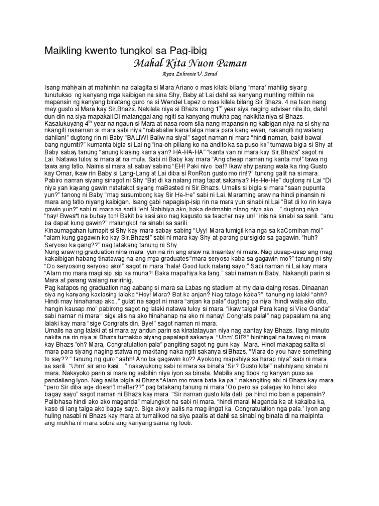 Ang makapagtapos sa pag-aaral. Maikling Kwento Pag-ibig Ang Kuwento ni Mabuti Buong Kwento Halimbawa 3 Halimbawa 5 Naging klasiko ang kuwentong ito na isinulat ni Genoveva Edroza-Matute na inaaral din ng mga estudyante sa paaralan. Panganay na anak ng mag-asawa si Kiko.