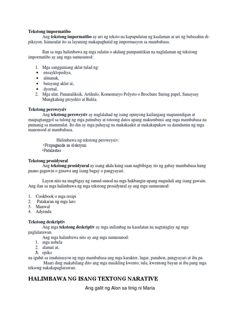 Mga halimbawa ng tekstong deskriptiv kwento. TEKSTONG NARATIBO Sa paksang ito ating tatalakayin kung ano nga ba ang tekstong naratibo at ang mga halimbawa nito. Sa mga kuwentuhan at mga tekstong nababasa natin sa ibat ibang babasahin hindi maaaring walang bahagi kung saan inilalarawan natin ang isang tao o bagay. Ito ay maaaring maging tungkol sa isang bagay tao haop pangyayari o kwento na pwede maging tototoo o hindi.