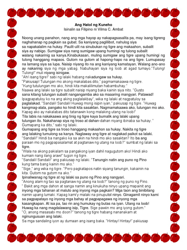 Ang pangako ng tigre sa lalaki. ANG HATOL NG KUNEHO Isinalin sa Filipino ni Vilma C. Ang Hatol ng Kuneho Noong unang panahon nang ang mga hayop ay nakapagsasalita pa may isang tigrengnaghahanap ng pagkain sa gubat.